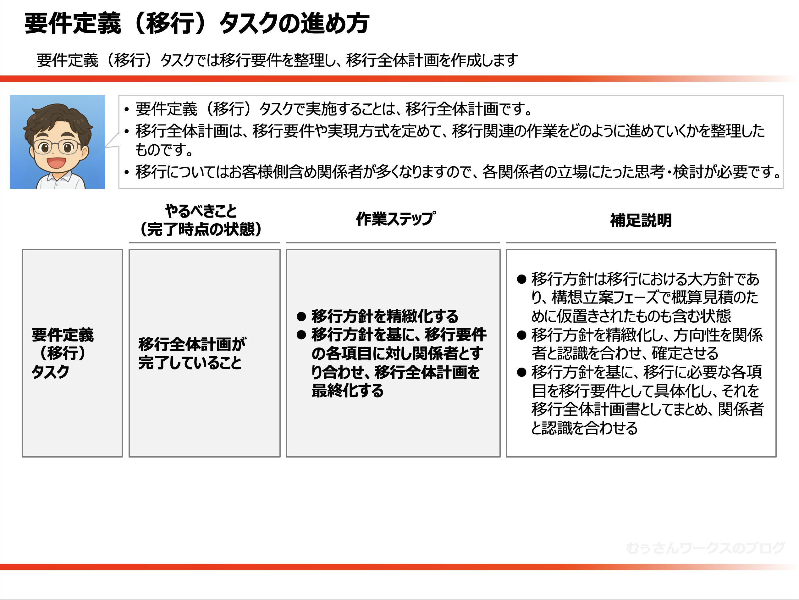 移行における要件定義の作業は、移行方針を精緻化し移行全体計画を策定することです。