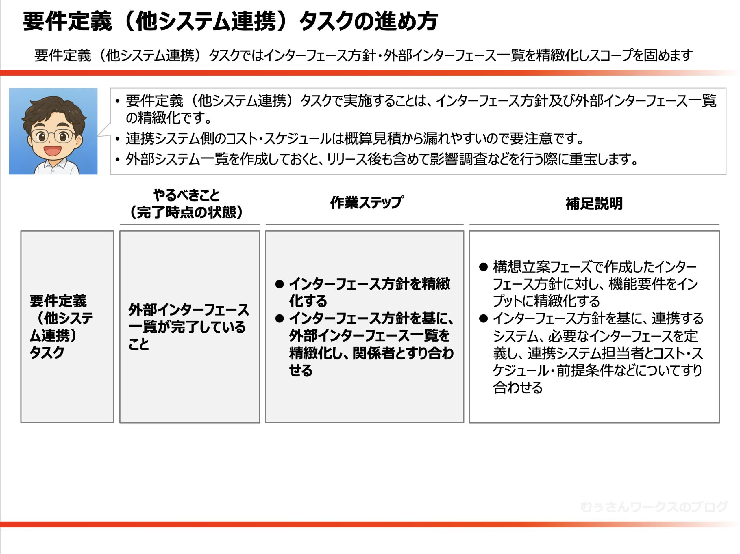 他システム連携における要件定義の作業は、インターフェース方針を精緻化し、各システム担当者と外部インターフェース一覧を確定することです。